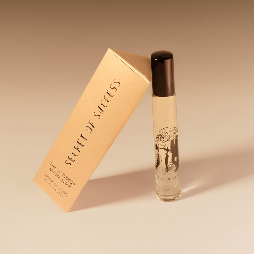It is sold in a playful and geometric golden packaging, in the Art Deco style, the bottles bear the illustrations of the States of Mind that correspond to them.